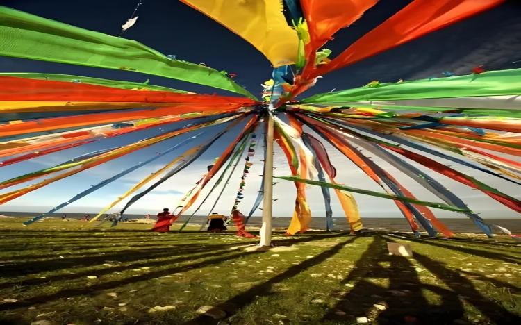 尼玛堆上经幡随风,双手合十,祈祷风祈祷雨祈祷吉祥,膜拜五彩斑斓,膜拜神山圣水,膜拜万物灵源,红色太阳蓝色天空白色云朵,绿色的草原河流镌刻在黄色袤远的沃地,青稞在低处涌动牦牛自由自在坡上低头吃草......